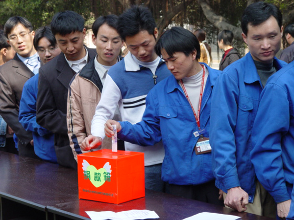 2005年1月3日,在廣東粵銘企業集團公司董事長李仲卿先生的號召下,粵銘集團旗下的東莞市粵銘激光技術有限公司、上海市粵銘激光技術有限公司、天津市粵銘激光技術有限公司、深圳市粵銘激光軟件研究所及遍布全國的三十多個辦事處的共500多名職工在向受災地區遇難人員默哀三分鐘以后,積極涌躍地向東南亞受災人民捐款。拳拳之心,深深表達了粵銘人對災區人民的深切關懷。在愛心大行動中,感動了前來粵銘公司訂貨和參加技術培訓的眾多國內外客戶,他們也積極參與到粵銘激光的捐款隊伍里來。