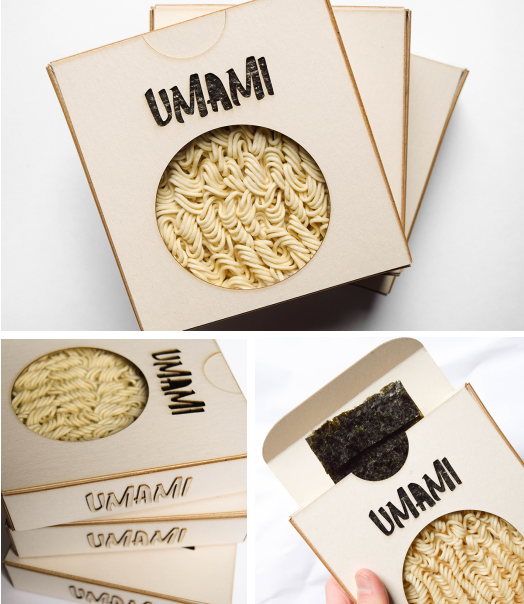 包裝設計師Liz Fu秉承著這種綠色環保的原則,使用可回收、可降解的材料,用激光工藝取代油墨印刷,在正面呈現鏤空產品logo,并將切割出的LOGO粘貼在側方,另外還心思巧妙地使用激光切割技術切割出一個切口光滑無毛刺的圓形切口包裝來展示這個拉面的質地,同時,將方便面的調味包放在紫菜口袋內從而省去塑料袋。將產品的天然環保表現得淋漓盡致。