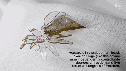 軟體蜘蛛機器人沒有剛性部件,完全是從微流體系統中獲得動力實現各種能力的,其主體內部就是 激光設備加工出的一個復雜的微觀通道網絡系統,在向該系統泵送液體時,蜘蛛的眼睛就會變亮,就像是孔雀蜘蛛般呈現豐富的腹部圖案,同時會驅動其四肢移動。