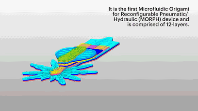 而這個軟體蜘蛛機器人是怎么制成的呢?該團隊表示,采用了MORPH(Microfluidic Origami for Reconfigurable Pneumatic / Hydraulic)氣壓/液壓重構的微流體折疊系統,MORPH系統融合了三種不同的制造技術。