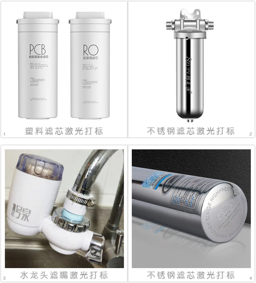 激光打標機可針對市場上主流的凈水器濾芯外殼材料進行打標,包括塑料外殼,含其中的PP、PE、PVC、ABS等塑料材料,及不銹鋼外殼、鋼化玻璃外殼等。