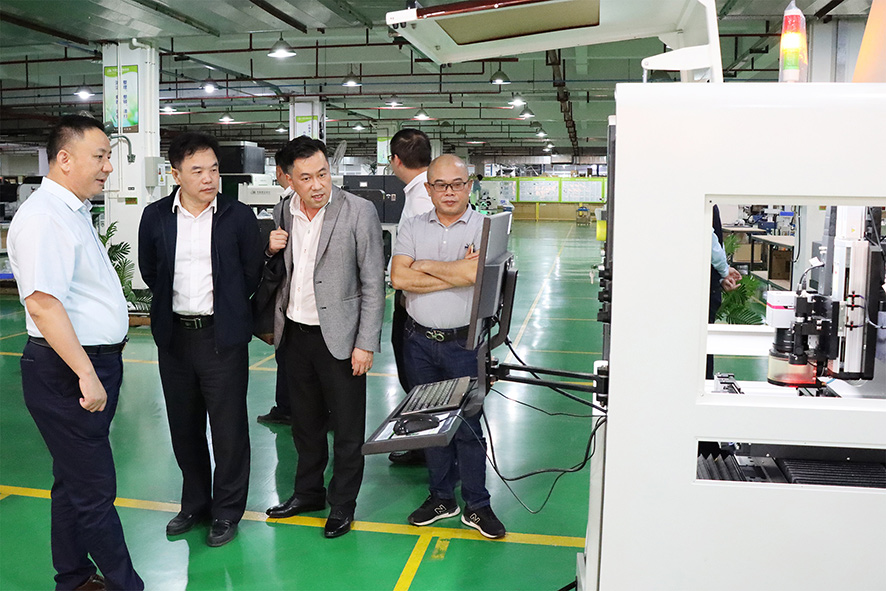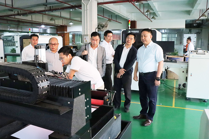 在集團執行董事兼總經理卓勁松先生的陪同下,來訪領導一行參觀了粵銘激光集團現代化智能制造生產中心、研發中心與激光設備展示廳,在參觀的過程中,卓總詳細介紹了我司各系列高端激光裝備的技術亮點及其應用領域。先進的激光工藝、前沿的激光應用和現代化的智能生產車間給來訪領導們留下了深刻的印象,不時好奇的與卓總探討激光在各自領域的用途。