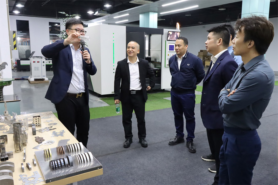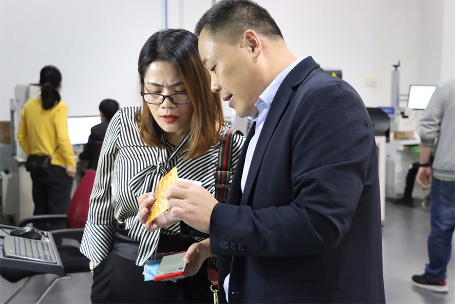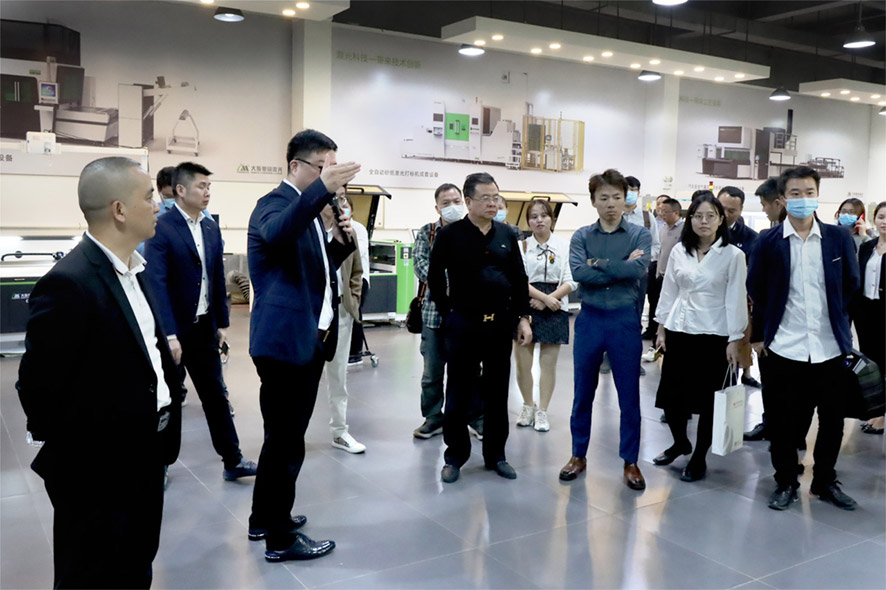 座談會后,在王總的陪同下,余會長及企業家朋友們參觀了大族粵銘激光集團產品展示廳,現場感受我司前沿的激光技術成果及成品展示,聽介紹、看設備,直觀的了解了激光技術在電子行業的前沿應用。