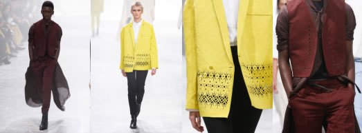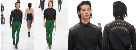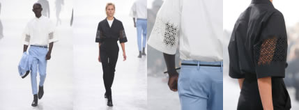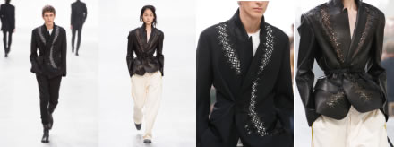激光鏤空工藝貫穿了整場秀,西裝外套、襯衫、皮帶、裙子、馬甲等地方都能看到激光鏤空印花的設計,不僅呈現出慵懶知性的主題,而且也讓我們看到服裝面料激光鏤空機能夠創造出更多的可能性。