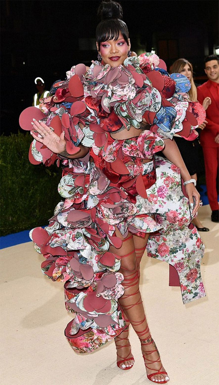 2017年Met Gala最令人難忘當(dāng)屬蕾哈娜的激光切割提花片造型,狂野造型格外引人注目。亮眼的紅色貼上中式碎花圖案,拼接出了如同“雕塑藝術(shù)”般的禮服,讓蕾哈娜看起來(lái)更顯別樣的華麗和隆重。