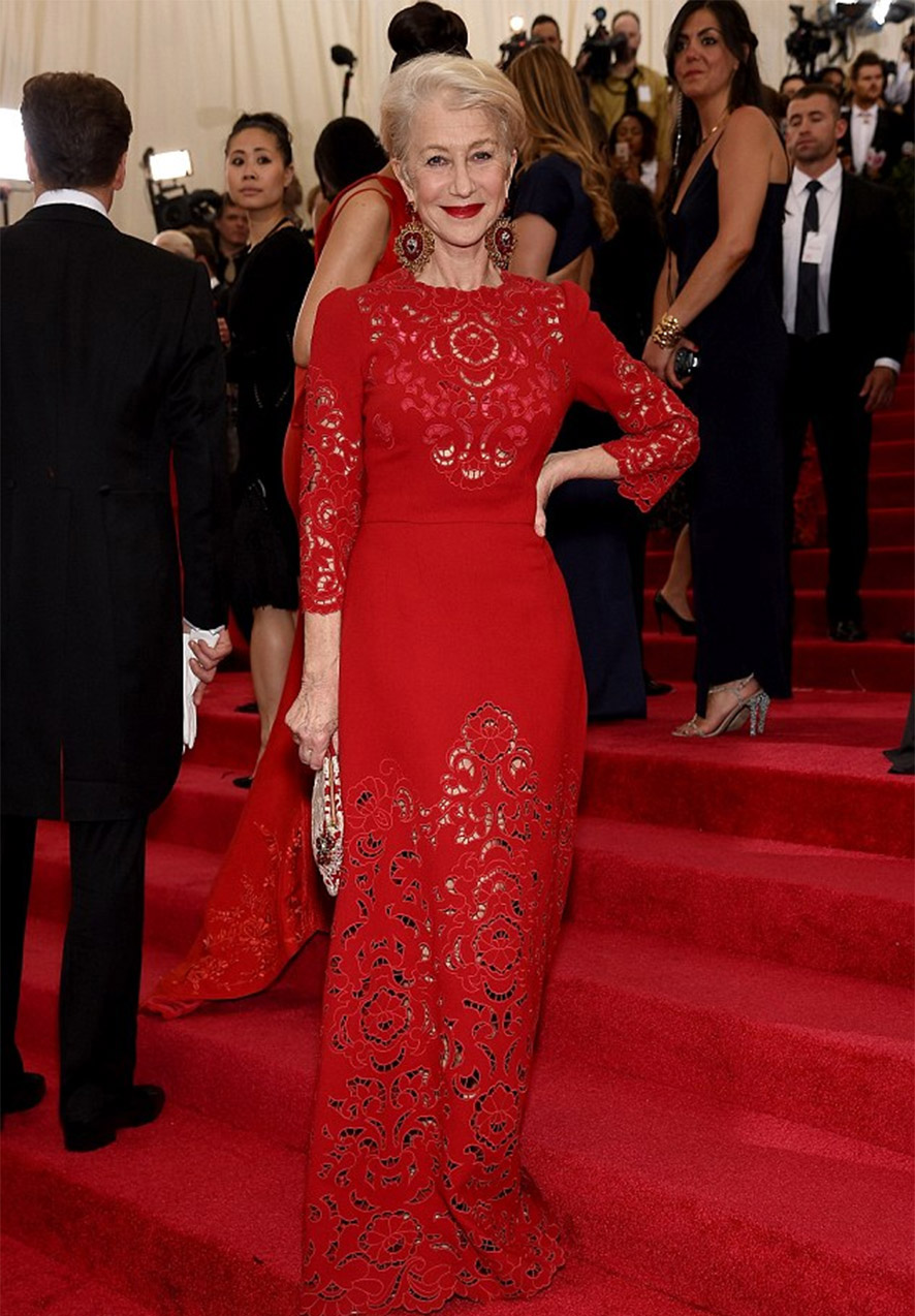 2015年飾演過(guò)《伊麗莎白一世》的奧斯卡最佳女主角獲得者海倫·米倫一襲紅色激光切割坎普風(fēng)禮服驚艷全場(chǎng)。