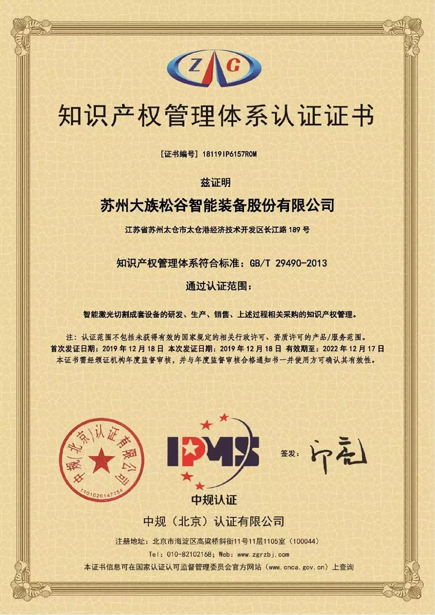 我司旗下子公司大族松谷激光榮獲“知識產(chǎn)權(quán)管理體系認證證書”